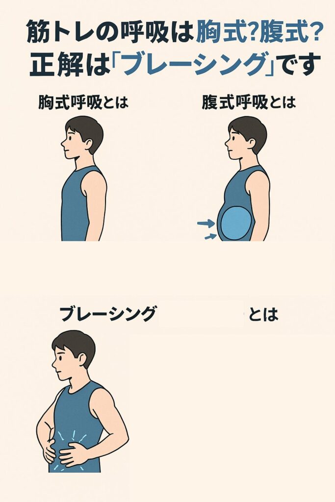 この記事では、筋トレで使うべき呼吸法「ブレーシング」と、よく混同される胸式呼吸・腹式呼吸の違いを整理します。